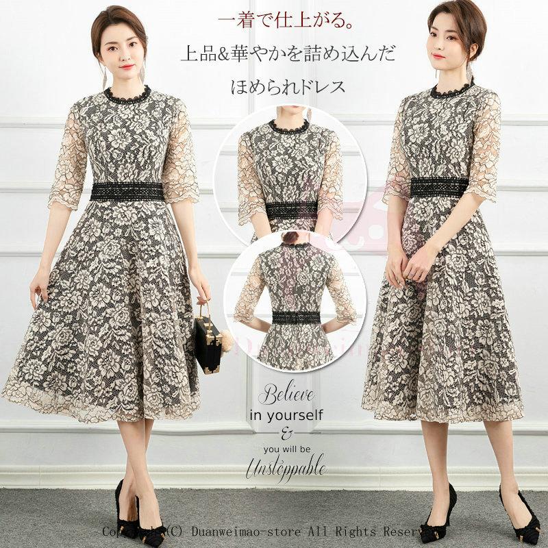 お呼ばれ 結婚式 披露宴 食事会 二次会 演奏会 パーティードレス ワンピース ドレス フォーマルドレス 服 大人 レディース 袖あり 7分袖 レース 披露宴代 30代 40代